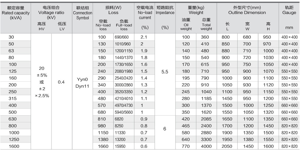 主要特點與技術(shù)參數(shù):Main functions and characters 采用先進電磁設(shè)計軟件設(shè)計,性能符合IEC60076、GB1094、GB/T6451、GB/T25289-2010標準。無儲油柜、吸濕器等裝置,確保變壓器油不與空氣接觸,能提高變壓器油抗氧化能力,延緩變壓器油老化。鐵心采用優(yōu)質(zhì)冷軋晶粒取向硅鋼片,全斜接縫疊片結(jié)構(gòu),從而降低空載損耗和空載電流。油箱為波紋油箱,波翅可以隨變壓器油體積的脹縮而脹縮,從而使變壓器內(nèi)部保持一定的壓力,增強運行可靠性,變壓器外表抗腐蝕能力強。配電變壓器線圈采用高強度漆包線(或紙包線)卷繞,安匝分布均勻,絕緣結(jié)構(gòu)合理,具有很強的抗短路能力。配電變壓器器身采用免吊芯結(jié)構(gòu),密封件采用優(yōu)質(zhì)丙烯酸酯橡膠,能有效防止光老化、熱老化。 S11-M系列三相雙繞組無勵磁調(diào)壓20kv配電變壓器